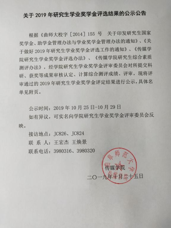 【来源:2019年研究生学业奖学金评选公示 | 发布日期:2019-10-25 】