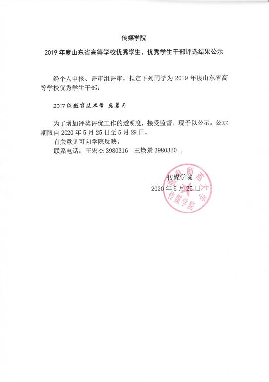 【来源:海棠文化 2019年度山东省高等学校优秀学生、优秀学生干部评选结果公示 | 发布日期:2020-05-25 】